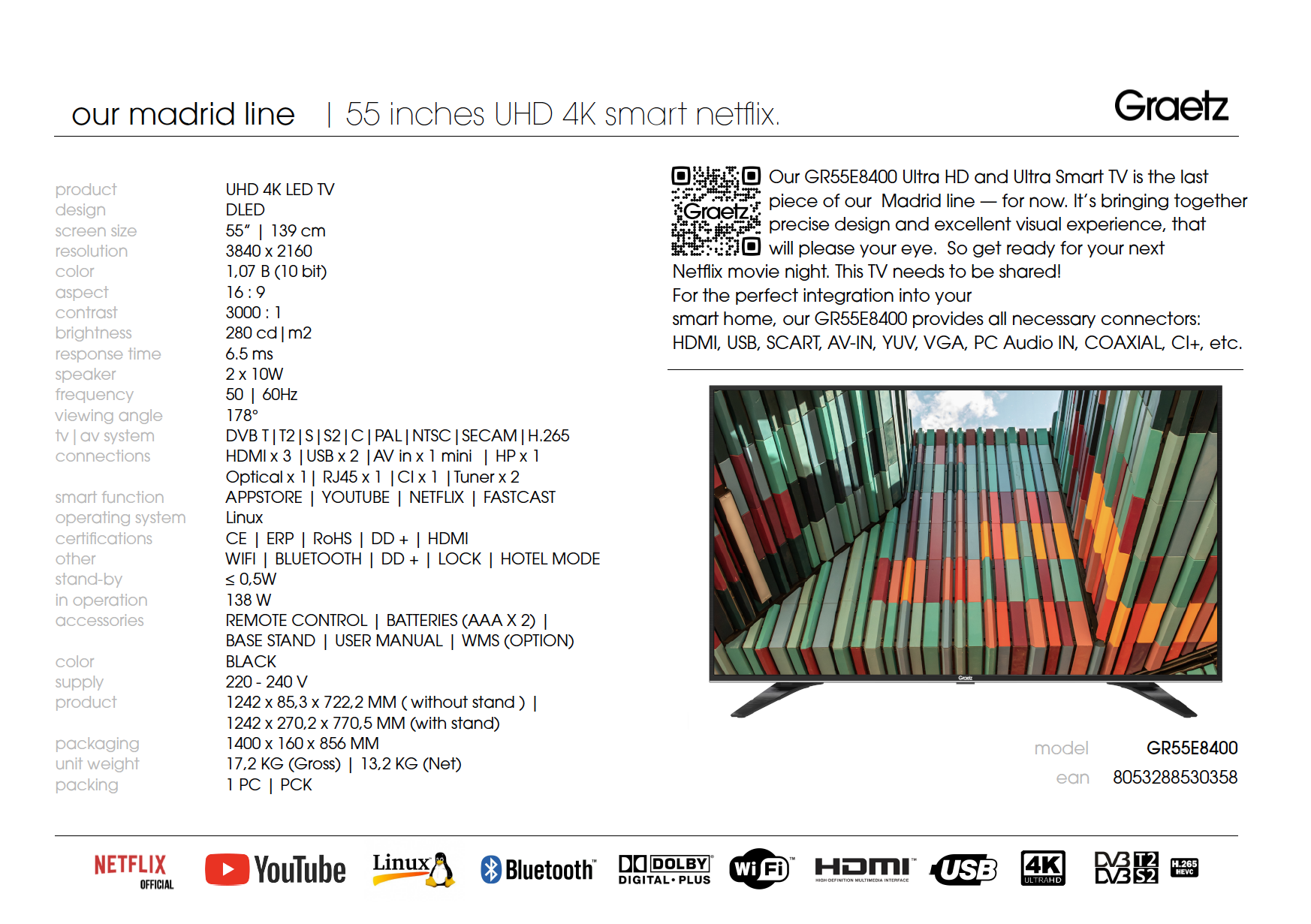 Our GR55E8400 Ultra HD and Ultra Smart TV is the last piece of our Madrid line — for now. It’s bringing together precise design and excellent visual experience, that will please your eye. So get ready for your next Netflix movie night. This TV needs to be shared! For the perfect integration into your smart home, our GR55E8400 provides all necessary connectors: HDMI, USB, SCART, AV-IN, YUV, VGA, PC Audio IN, COAXIAL, CI+, etc.